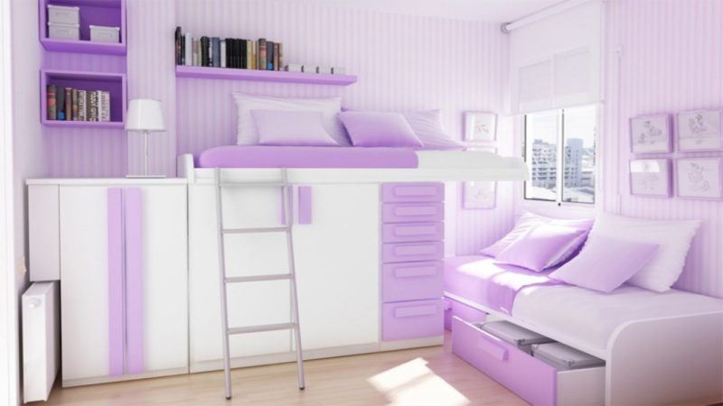 Лофт не терпит чересчур загроможденных пространств. Именно поэтому помещение, где будут жить девочки, следует обставить мебелью-трансформер. Это может быть, например, шкаф, который очень быстро превращается во вместительную кровать. Стены лучше всего окрасить в немаркие и не слишком яркие цвета.