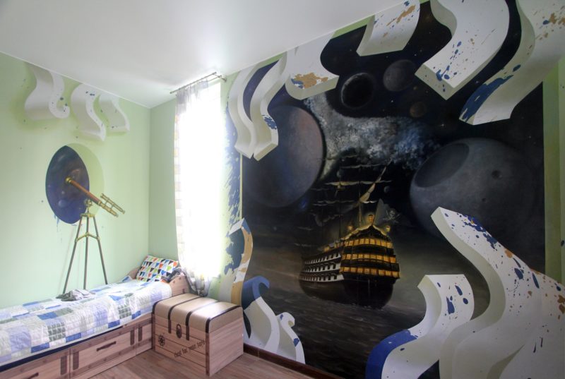 Украшением комнаты подростка в данном случае станут сувениры, привезенные из поездки на море, красивые морские пейзажи и модели кораблей, сделанные ребенком самостоятельно или вместе с отцом. Морская тематика для девочки создается при помощи ракушек, кораллов или фотографий ярких тропических рыб и морских пейзажей.