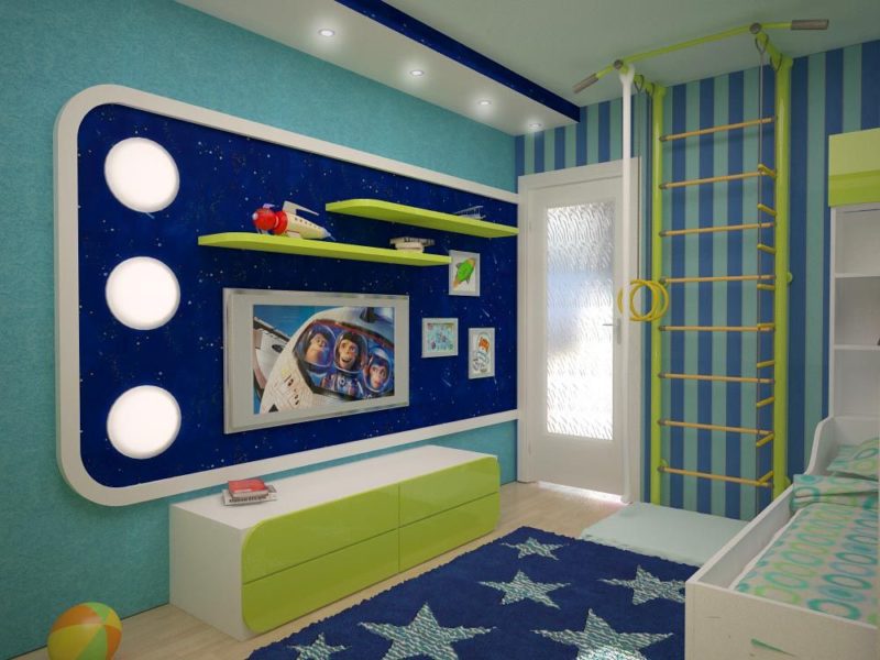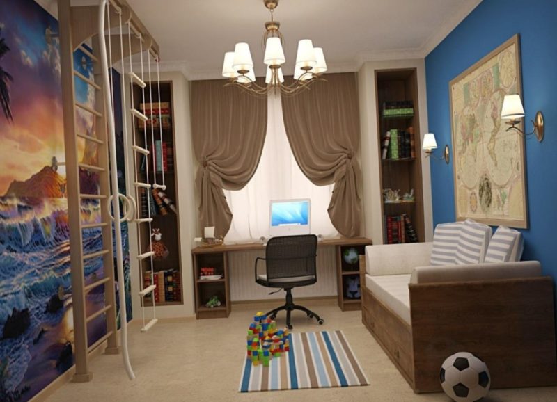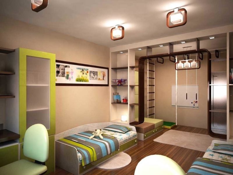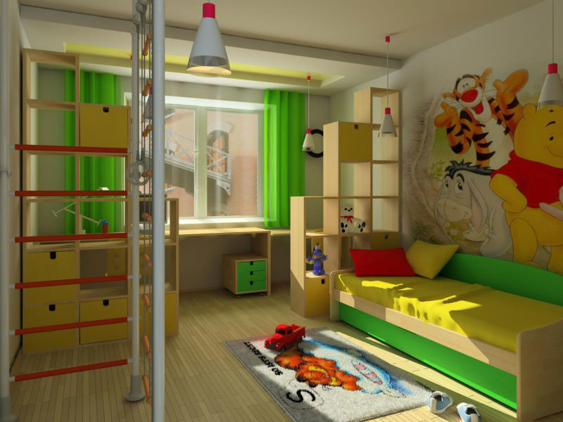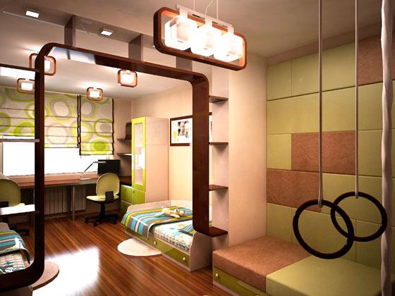 Оборудование и украшение детской комнаты должно подчеркивать и выделять из общего интерьера три условные зоны: игровую, учебную и зону для отдыха. Если в комнате не хватает места для ее деления на три части, поможет креативная мебель, обладающая свойствами трансформера или отдельные предметы декора. Такое разделение помогает, с раннего возраста, приучать ребенка к порядку, аккуратности, самостоятельному принятию решений, дисциплинирует его. Если вы видите в своем отпрыске будущего спортсмена, подумайте об устройстве в игровой зоне спортивного уголка в виде компактной шведской стенки, подвесного турника, каната или спортивных колец. Систематические мышечные нагрузки очень полезны для общего физического развития.