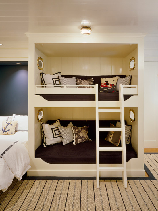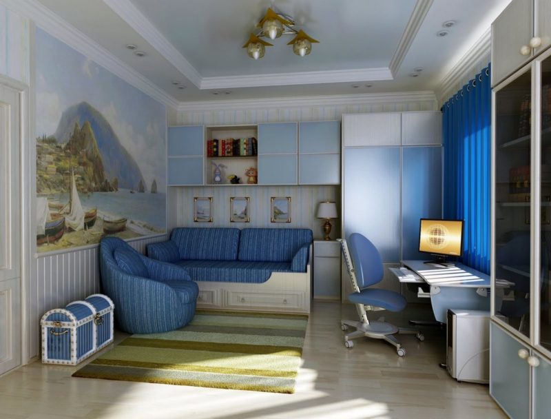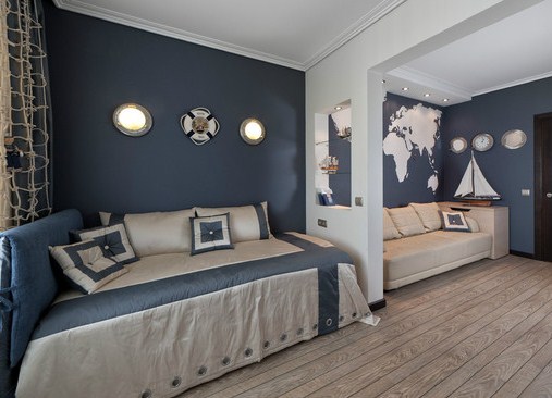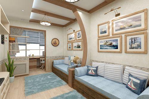 Морской стиль часто нравится подросткам. Благодаря сине-зеленой цветовой гамме комната становится удобной для зрительного восприятия и не утомляет глаза ребенка при длительном нахождении в таком помещении. Яркие оттенки в морском интерьере допустимы в основном для небольших элементов обстановки. Систему хранения для мелких вещей можно организовать из модульных шкафов, напоминающих рундуки.Комната для подростка