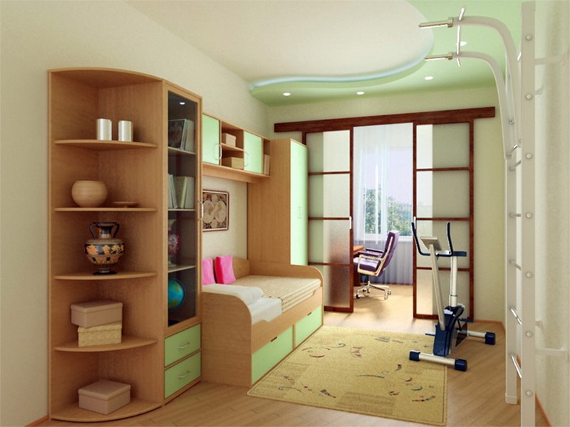 Уголок для спортивных занятий, место для хранения различных инструментов в комнате мальчика-подростка необходимо организовать обязательно. При недостатке площади можно обустроить рабочее место так, чтобы было удобно заниматься не только учебой, но и творческим хобби. Подростковая комната для ребенка, любящего активный отдых, должна быть обставлена таким образом, чтобы в ней поместился небольшой тренажер и спортивный уголок.