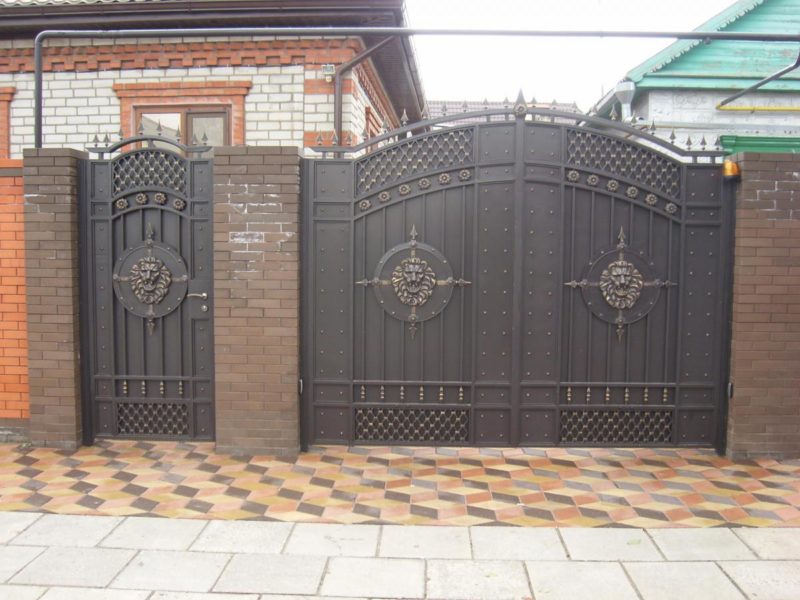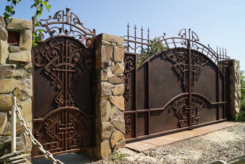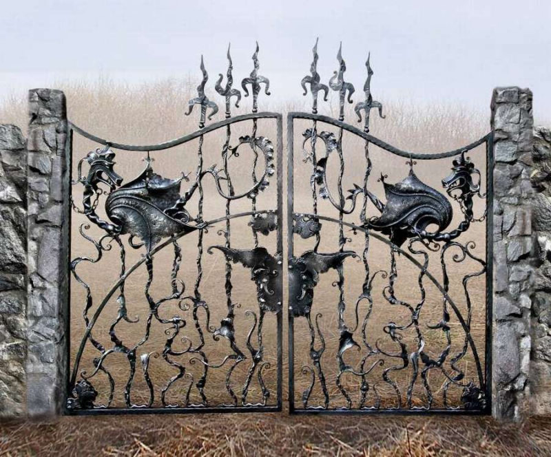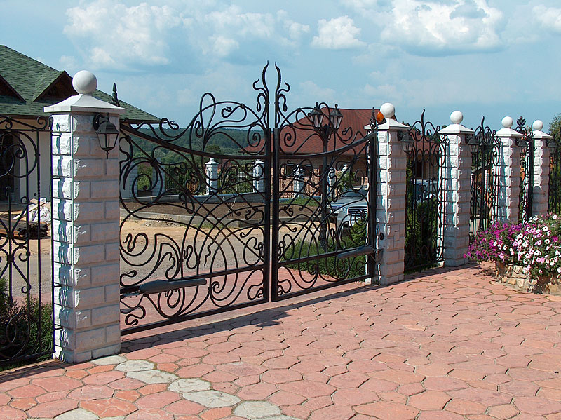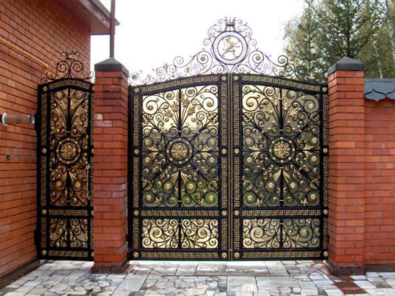 • Кованые ворота. Такой вид ворот смотрится поистине дорого и роскошно. Такие ворота будут гармонично смотреться с оградой из кирпича и металла.