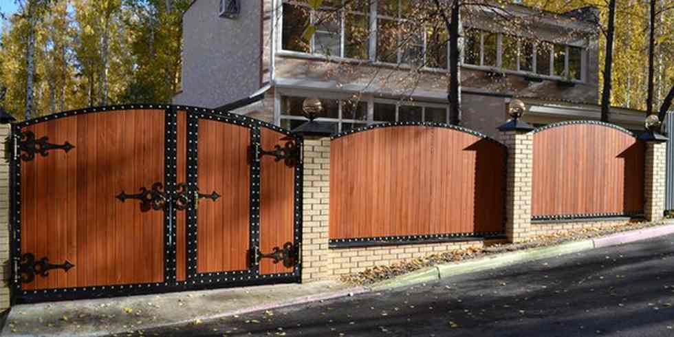 • Деревянные ворота. Невысокая стоимость и разнообразный дизайн помогут вам легко подобрать их под стиль ограждений.