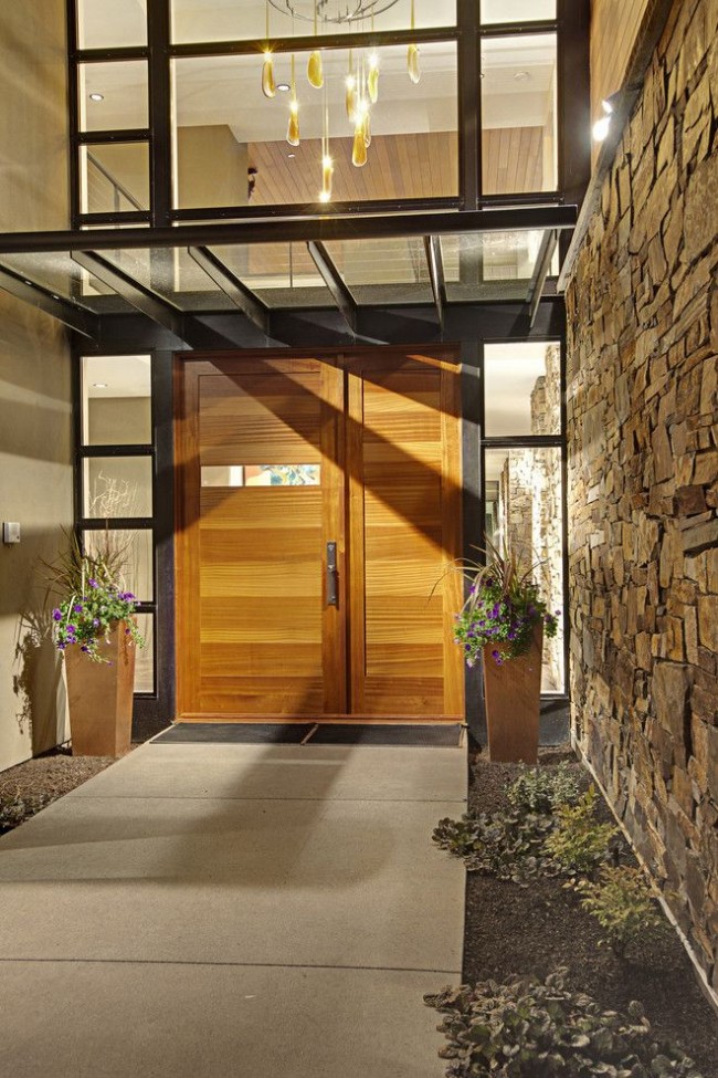 Как мы уже говорили, оформление навеса над крыльцом должно совпадать по стилю с экстерьером всего здания. Если ваш дом построен из деревянного сруба или кирпича в стиле кантри, то в данном случае козырёк должен быть деревянным с непрозрачной кровлей. Для дома, оформленного в стиле модерн, минимализм или хай-тек идеально подойдут подвесные конструкции из прозрачного материала. Оформляя дом в стиле прованс, вы можете использовать плоский навес над входом в качестве клумбы для цветов.Козырёк над крыльцом
