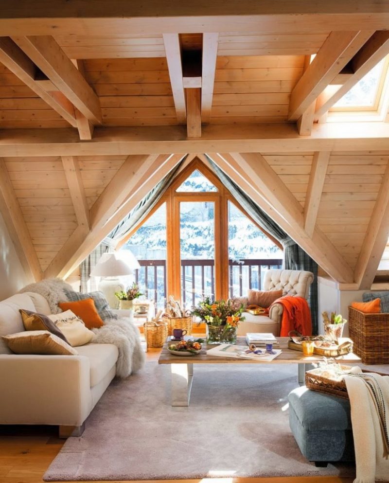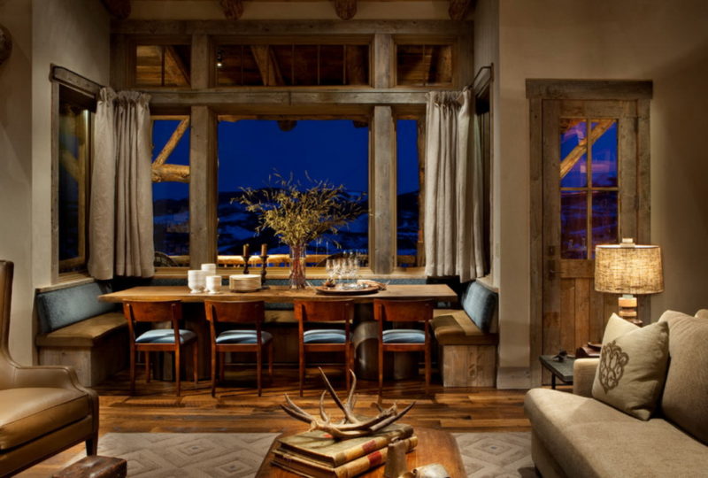 Отличный вариант, не акцентировать внимание на оконных проёмах — подбирать шторы цветом, близким к дереву, и длиной до подоконника. Они будут сливаться со стенами, создавая впечатление единой композиции.