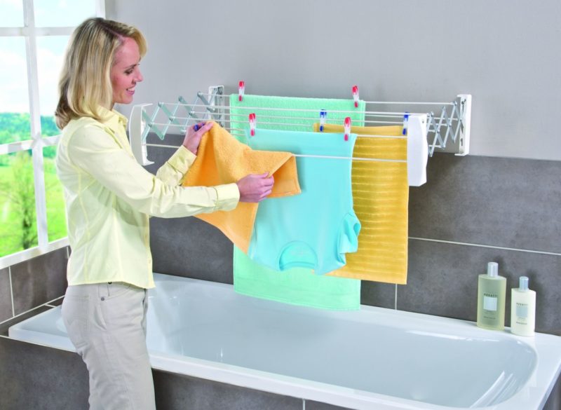 Раздвижные сушилки относятся к бюджетным моделям. В сложенном состоянии такая сушка занимает немного места и может быть использована в качестве держателя для полотенца. Разместить ее можно на любой высоте, в любом месте — там, где она не будет мешаться.