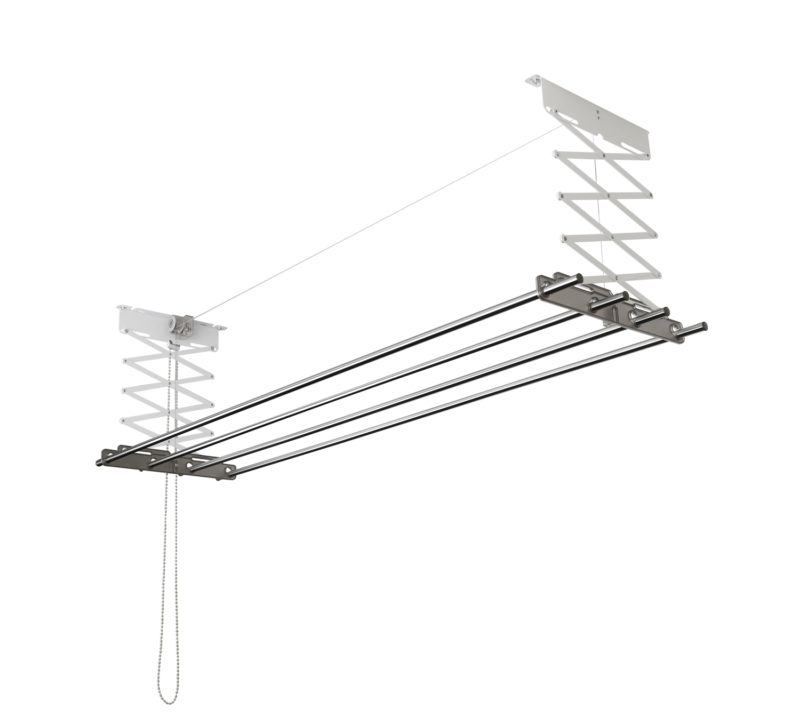 Система очень проста, но поднимать и опускать ее придется вручную. Когда влажного белья на перекладинах много, поднять сушилку бывает тяжело. Еще одно важное правило для этих механизмов — следить, чтобы не было перекосов из-за неравномерно распределенного белья. Все перекладины находятся на одном уровне, что замедляет процесс высыхания белья.