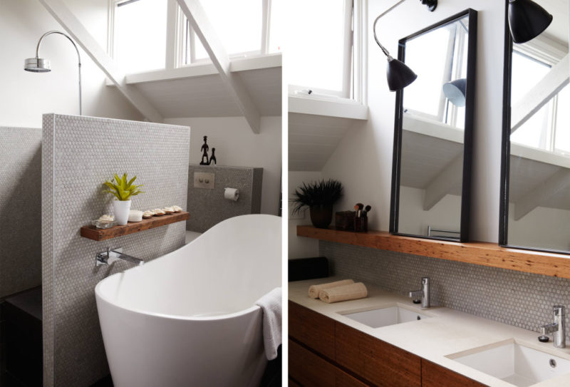 Ванная в стиле лофт оформляется с уклоном в минимализм: ванна с максимально простыми очертаниями без излишеств, краны и душевая лейка геометрических форм. Стены облицовываются керамогранитом или покрываются однотонной краской.