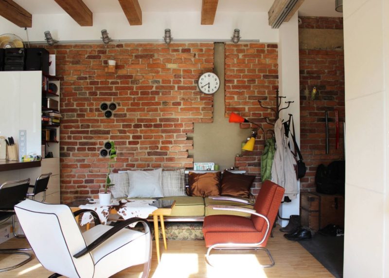 Чтобы обнажить кирпичную поверхность стены или ее часть, необходимо сбить штукатурку и дважды пропитать кирпич грунтом глубокого проникновения для каменных поверхностей, чтобы поверхность не загрязнялась и не пылила. Чтобы облегчить последующую уборку, следует нанести сверху два слоя водно-полимерной эмульсии. Если стены не кирпичные, то выполняется имитация кирпича из штукатурки, деревянных плашек и проч.
