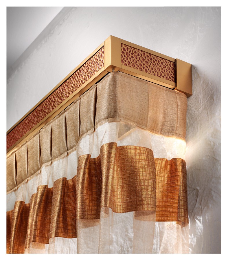 1. Жесткий каркас. Он выполняется особым образом при помощи специальной клеевой подкладки. Может иметь в зависимости от дизайнерской задумки самые необычные геометрические формы, мелкие элементы декора и сочетать несколько цветов. Такой вид несет более строгий и сдержанный стиль, прекрасно сочетается с тяжелыми шторами и легкой полупрозрачной тканью для гардин. Ламбрекены на жестком каркасе называют бандо.