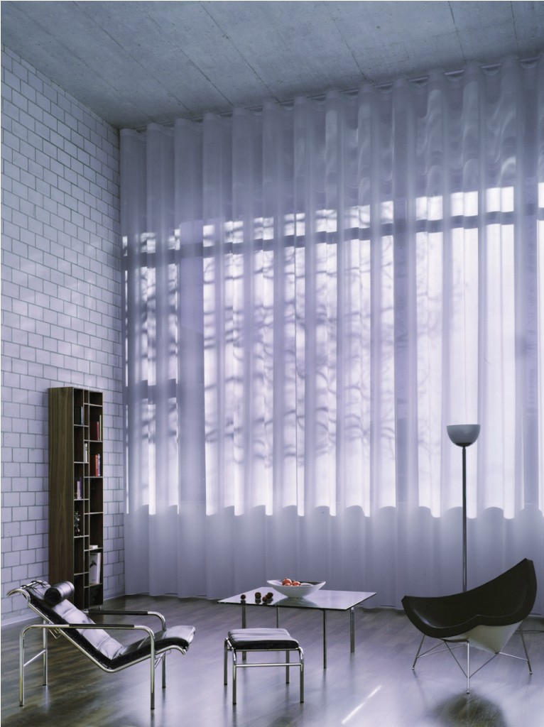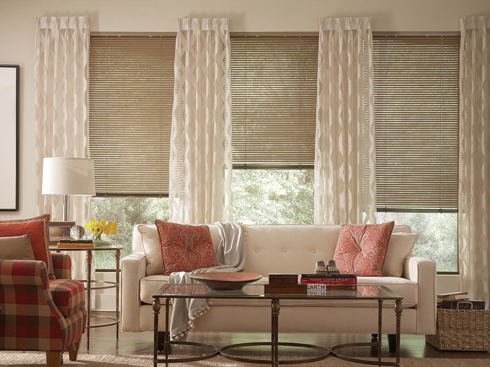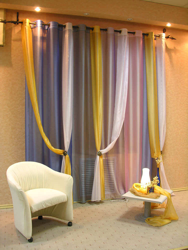 Легкий материал отлично сочетается с тяжелыми гардинами, классическими жалюзи. Если хочется наличия живописных складок, то можно воспользоваться струящимися пластичными тканями.Дизайн штор