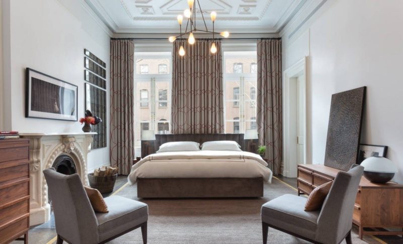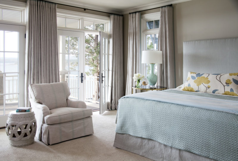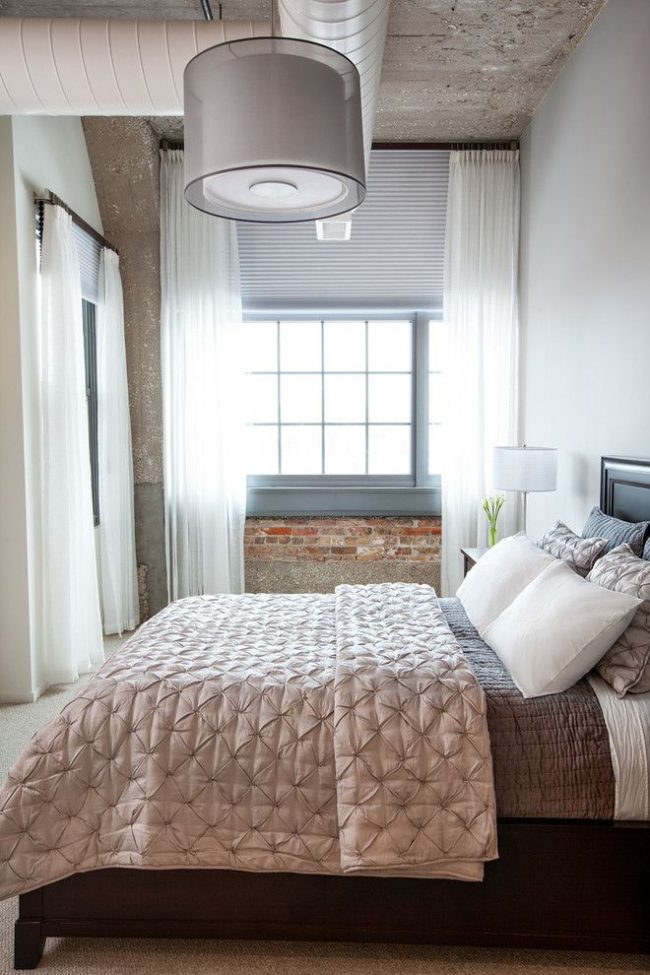 Наиболее уместным вариантом для спальни являются светонепроницаемые роллы, которые позволяют спрятать комнату от солнечного света. Если стилистика спальни не позволяет использовать только роллеты, их можно дополнить обычными текстильными занавесями в пол.