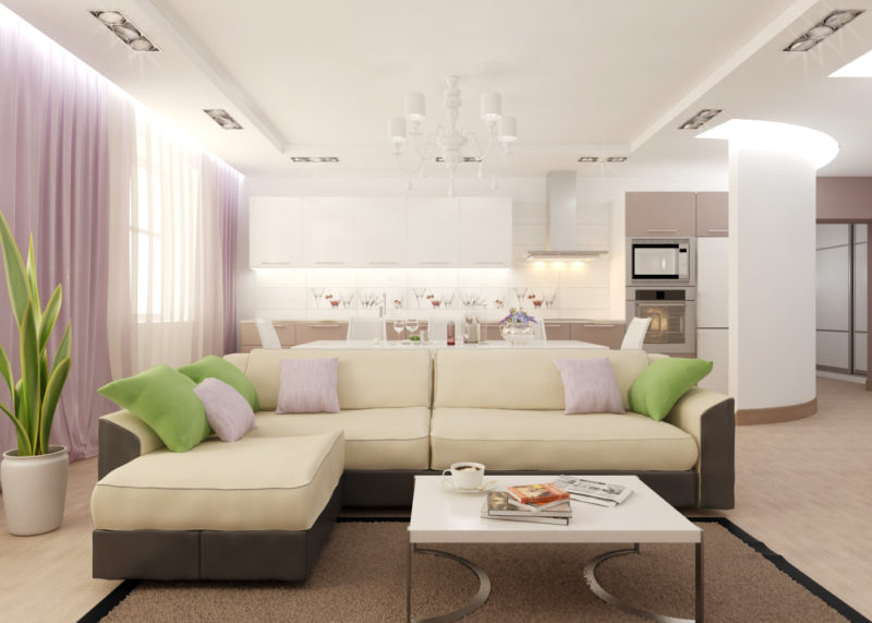 Если площадь небольшого размера, ее визуально помогут увеличить занавески светлых, теплых тонов. В темных помещениях, где свет неяркий, желательно повесить светлые портьеры. Холодные и темные цвета уменьшают пространство.Дизайн штор