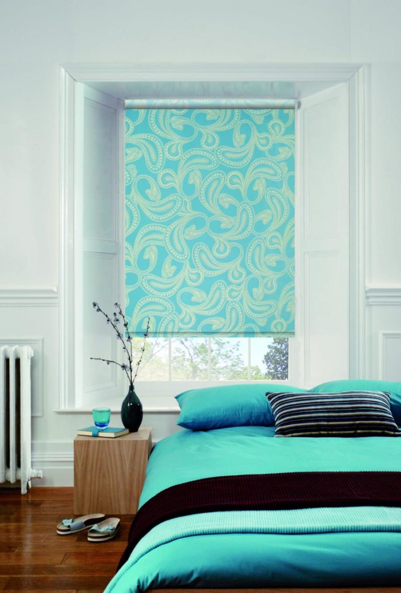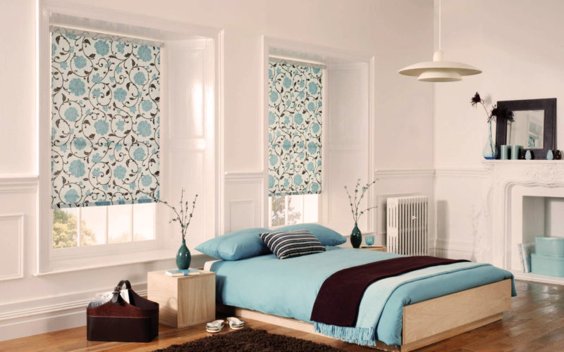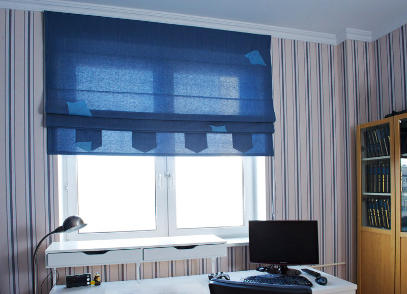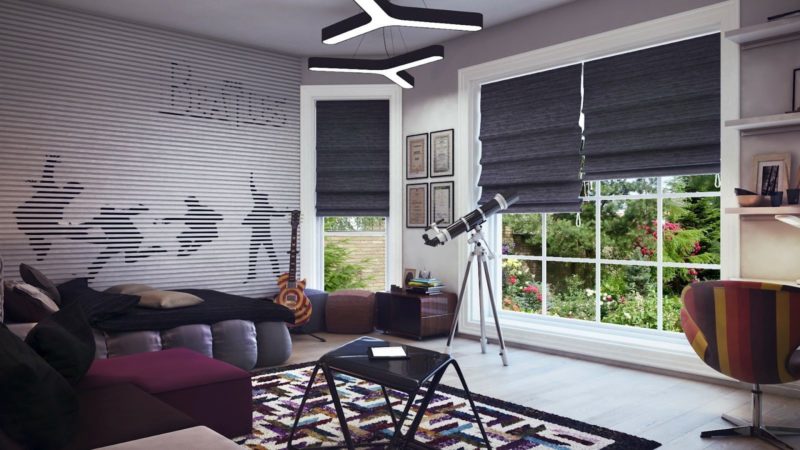 Сегодня популярностью пользуются римские занавески. Комната станет более живой и легкой за счет орнамента либо цветного рисунка.
