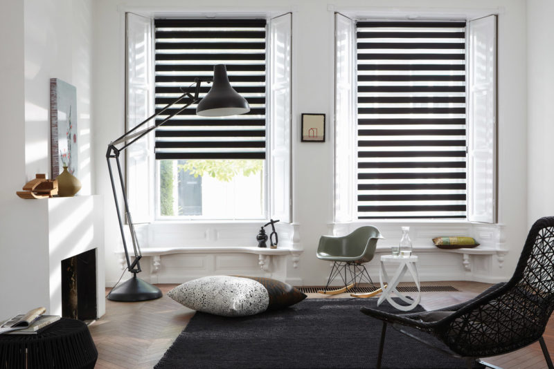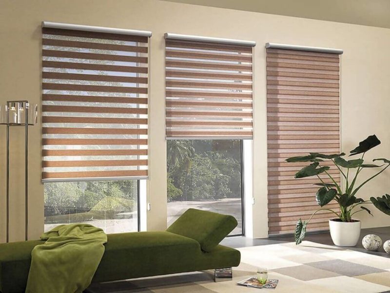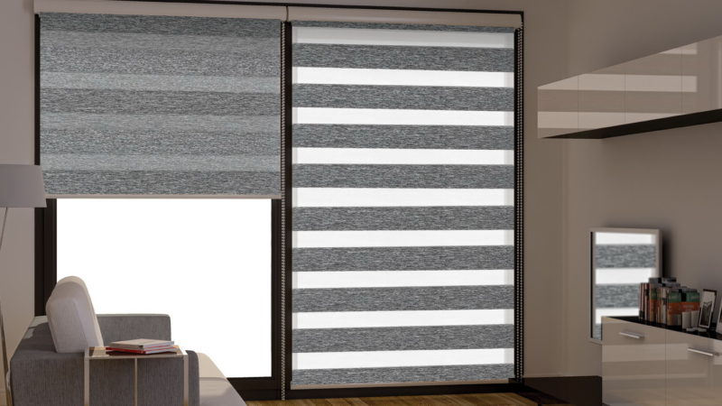 Роллеты «зебра» или «день-ночь» состоят из чередующихся полосок ткани с разной светопропускной способностью. Регулируя положение занавесей, можно добиться полного затемнения окон или оставить естественный свет.