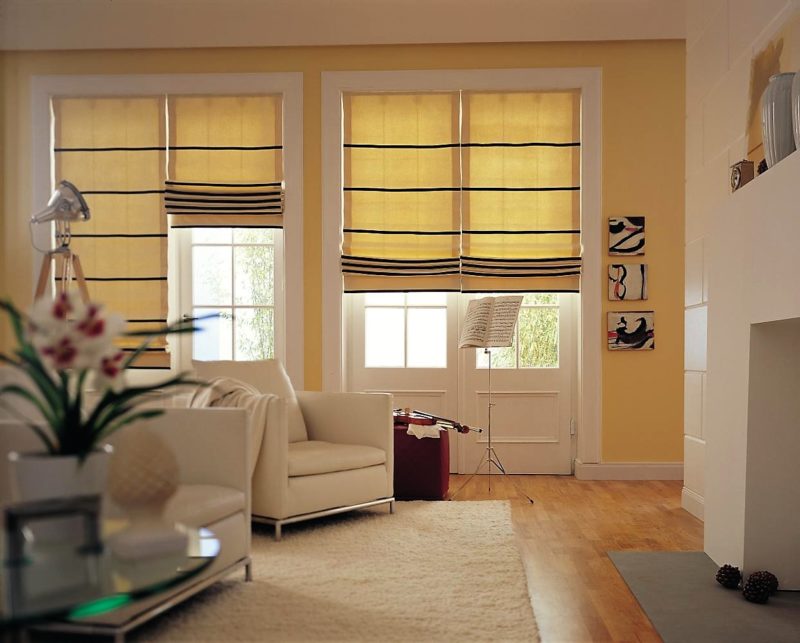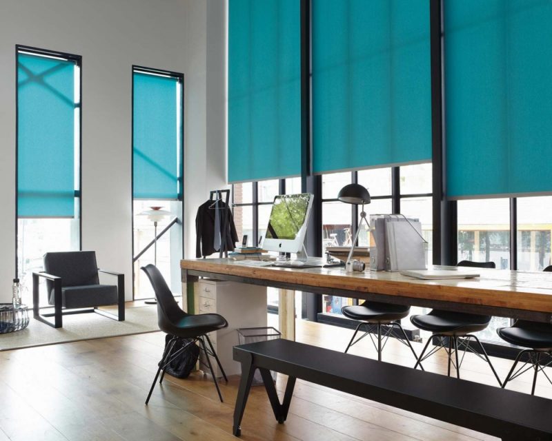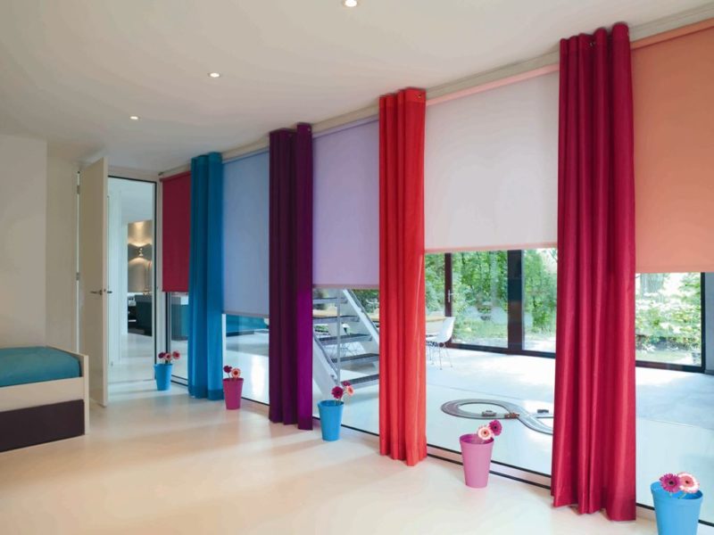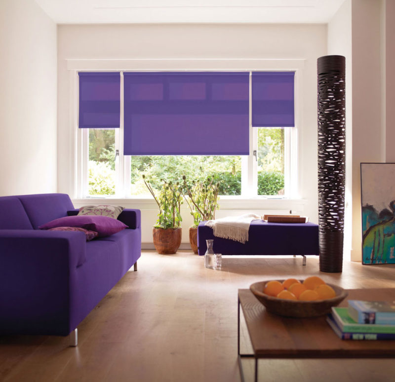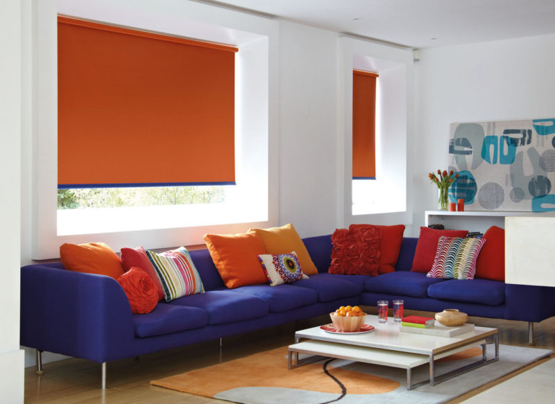 В зал лучше повесить роллеты чуть светлее цвета стен или сделать на них яркий акцент. Выбирая шторы выразительного оттенка нужно позаботиться, чтобы в интерьере комнаты были другие элементы такого цвета, к примеру элементы декора или текстиль.