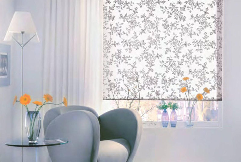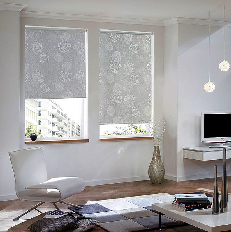 В гостиной будут хорошо смотреться рулонные занавески с различными принтами и декором. В этом случае важно не переборщить с количеством украшений, чтобы гармонично вписать роллеты в интерьер.