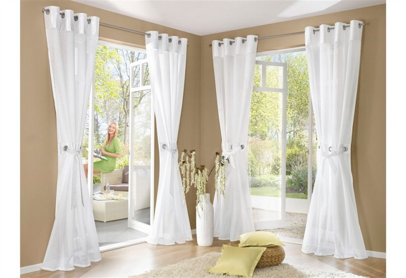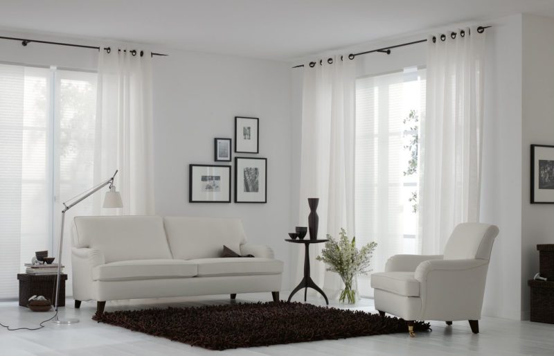 Единственным недостатком штор белого цвета является их маркость, на таких тканях всякие пятна становятся более заметными. Но эта проблема решается довольно просто, так как сегодня существуют средства, позволяющие тканям надолго сохранять белизну. Да и плюсов у материала такого цвета намного больше.Дизайн штор