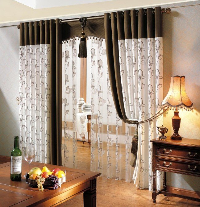 Бывают ситуации, когда необходимо, чтобы в одном помещении в какие-то моменты было темно, а в другие – светло. В этом случае поможет такой вариант – за полотнами темного цвета вешаются светлые шторы.