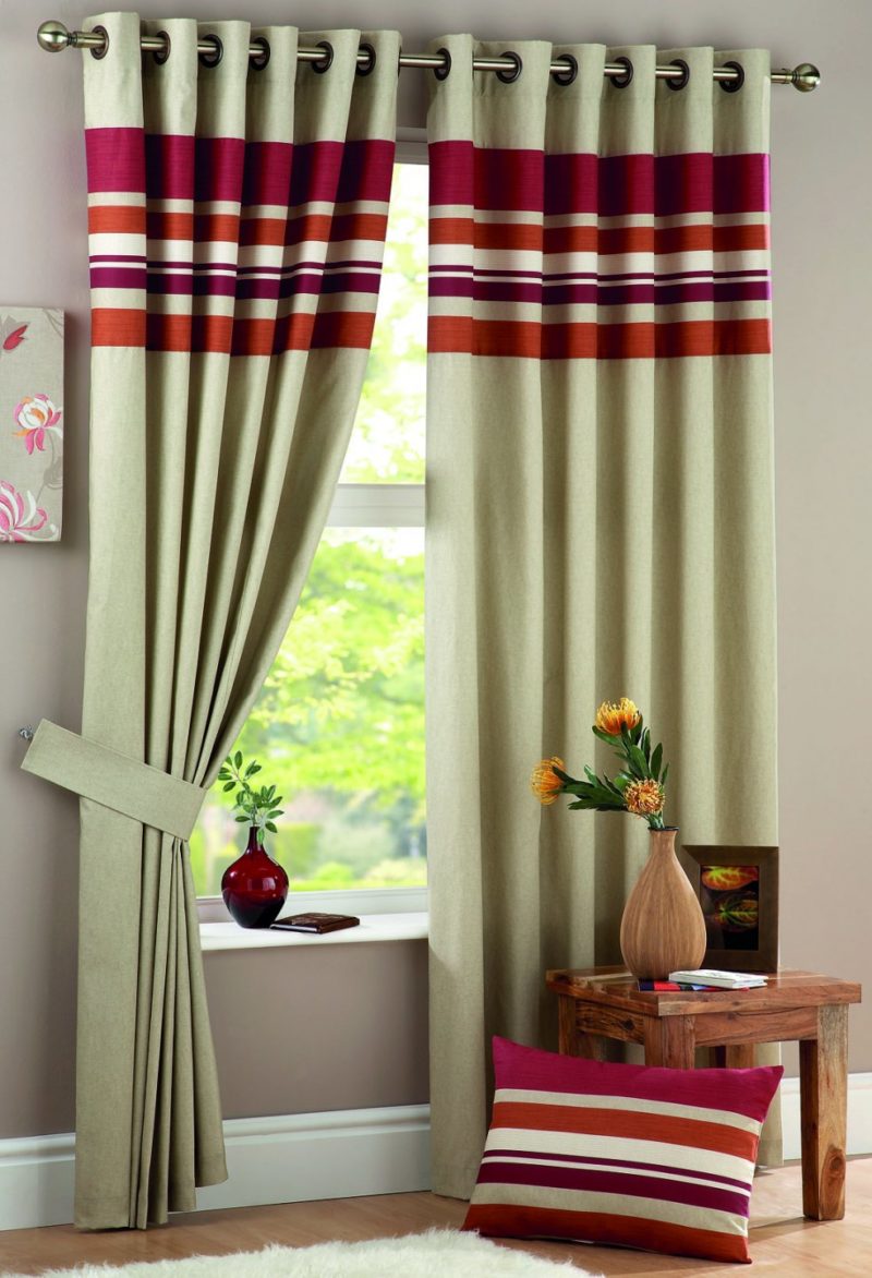 Пропорции комнаты влияют на дизайн штор. Визуально расширить помещение помогут изделия, пошитые из материала с обычными полосами либо поперечным рисунком.Дизайн штор