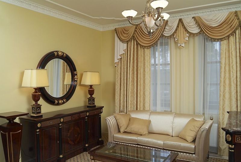 1. В стиле ампир присутствуют темные тона красного, синего и фиолетового. Часто украшаются массивной бахромой и узорами бронзового цвета. Данный вид изготавливается из достаточно тяжелых тканей, поэтому больше подходит для гостиных комнат.