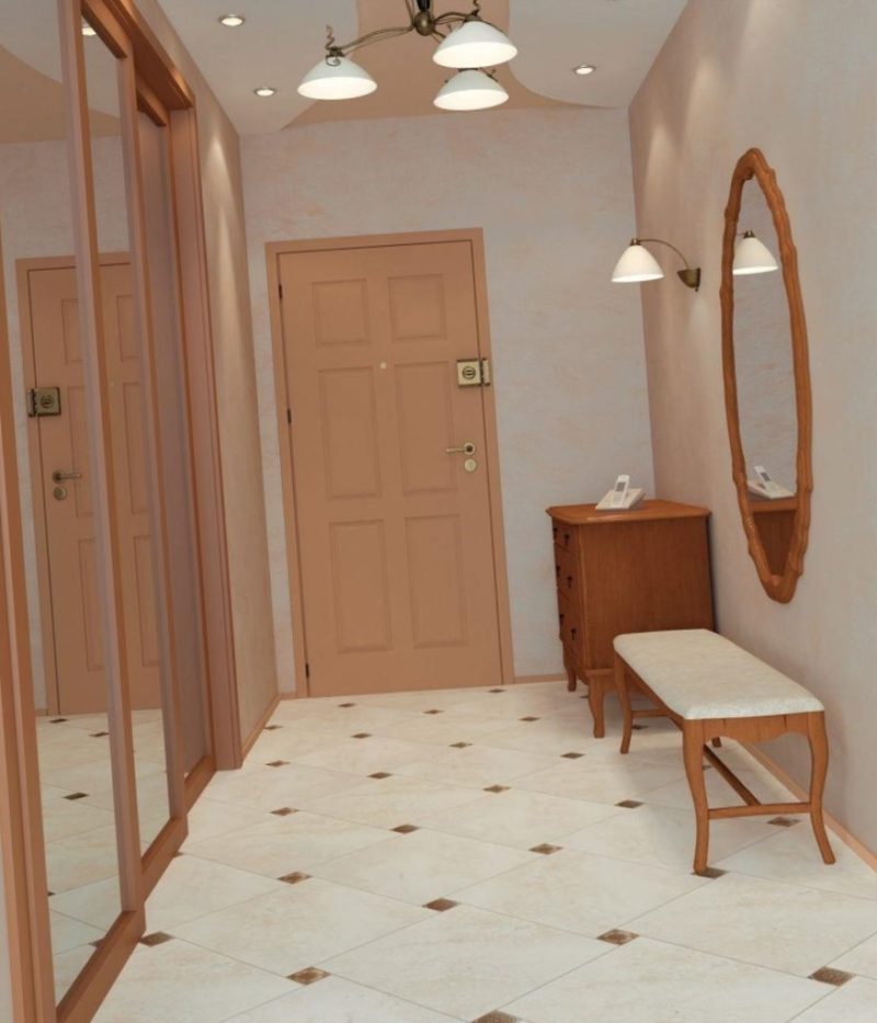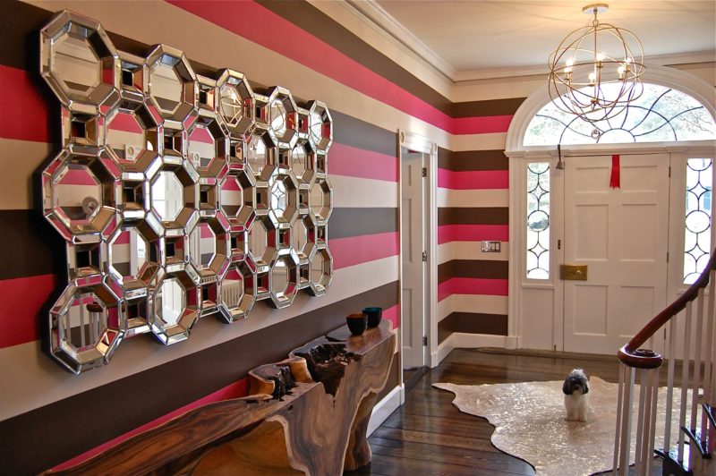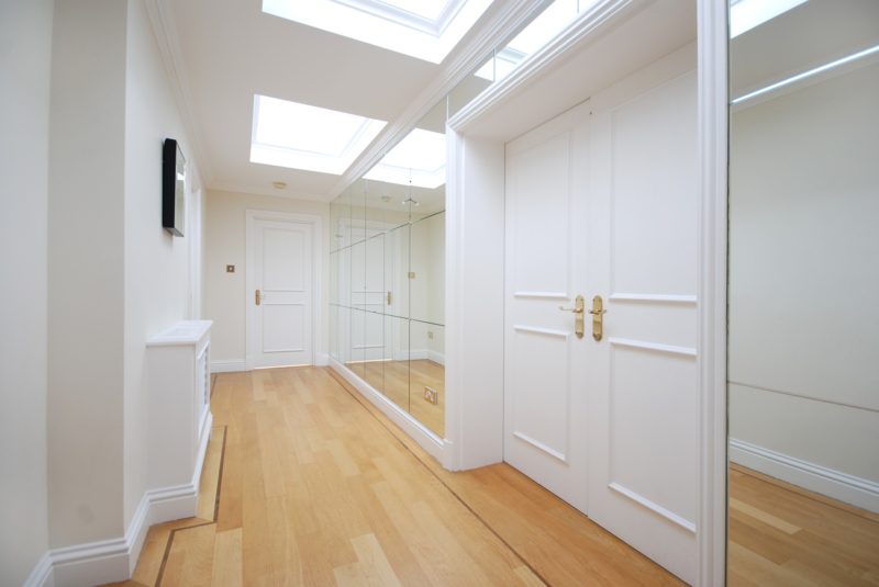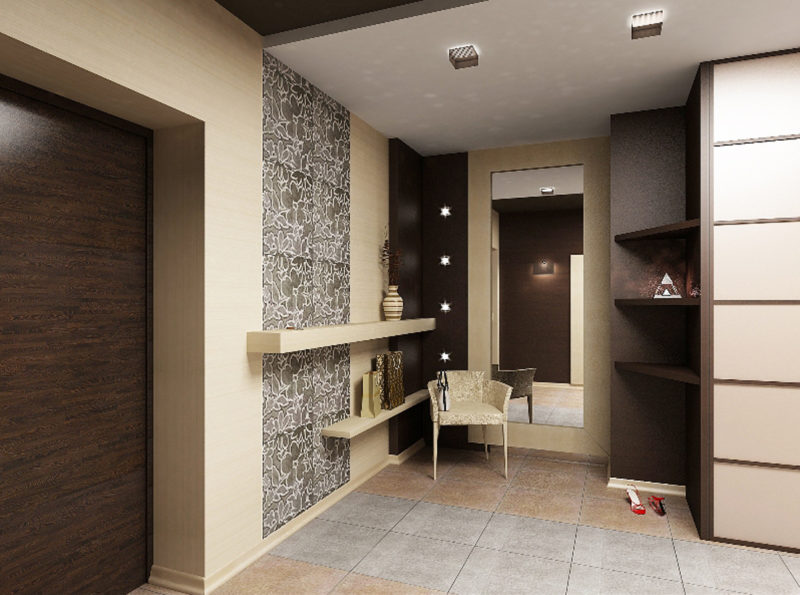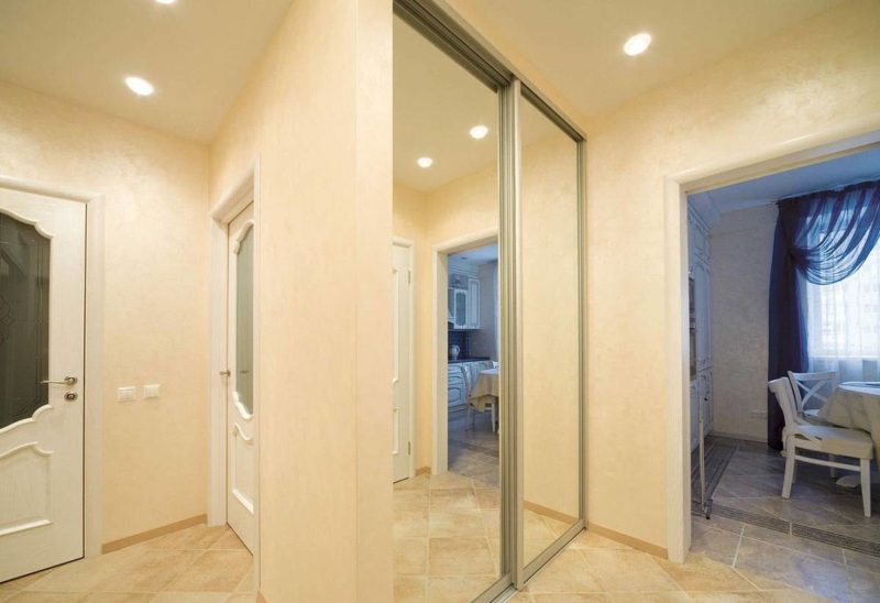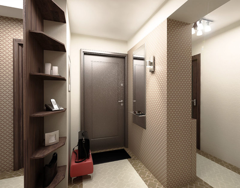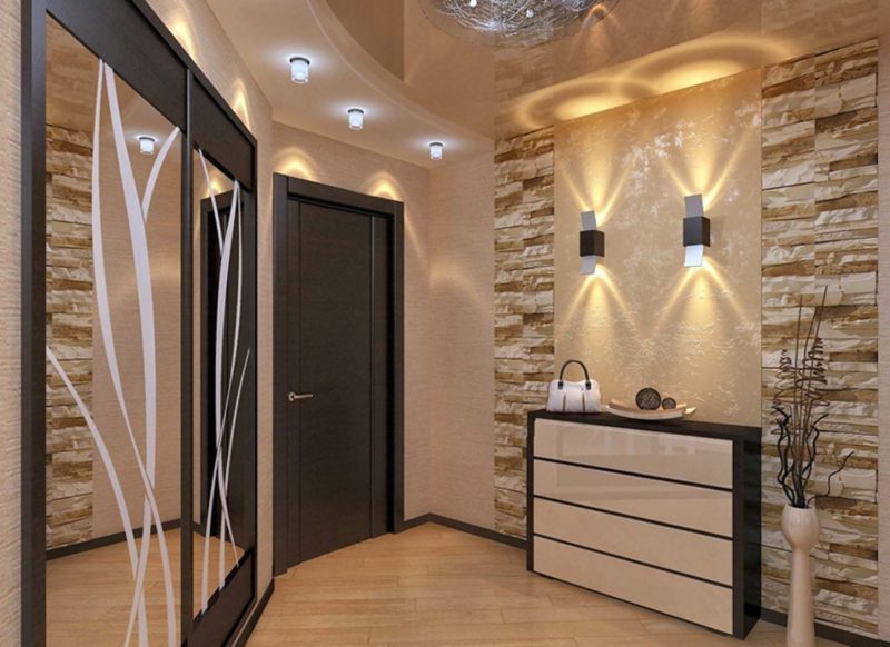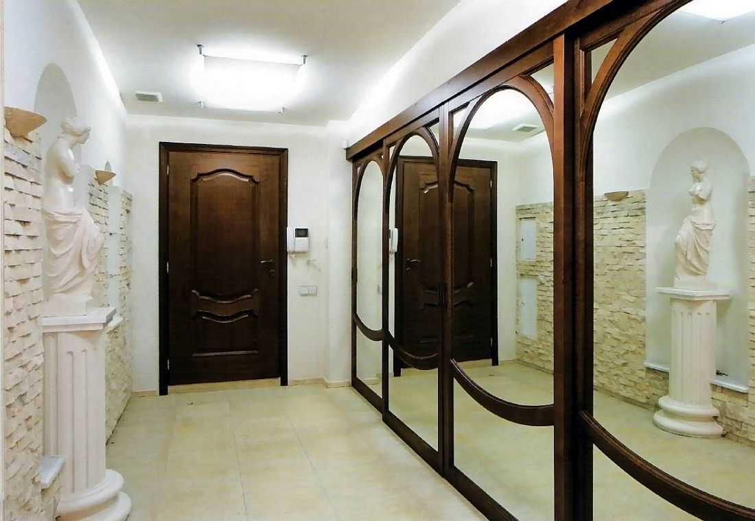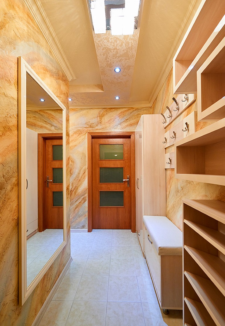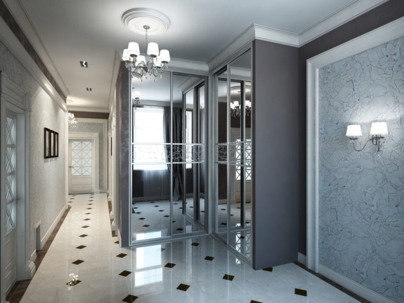 2. Узкий коридор должен быть отделан обоями с максимально отражающей поверхностью, а при неимении таковых требуется установка нескольких зеркал. Такое решение визуально расширит пространство и сделает комнату более просторной.
