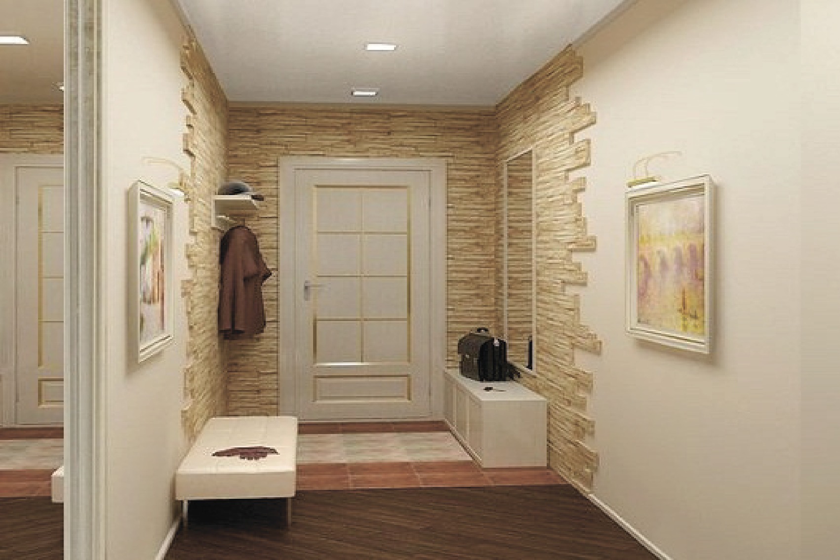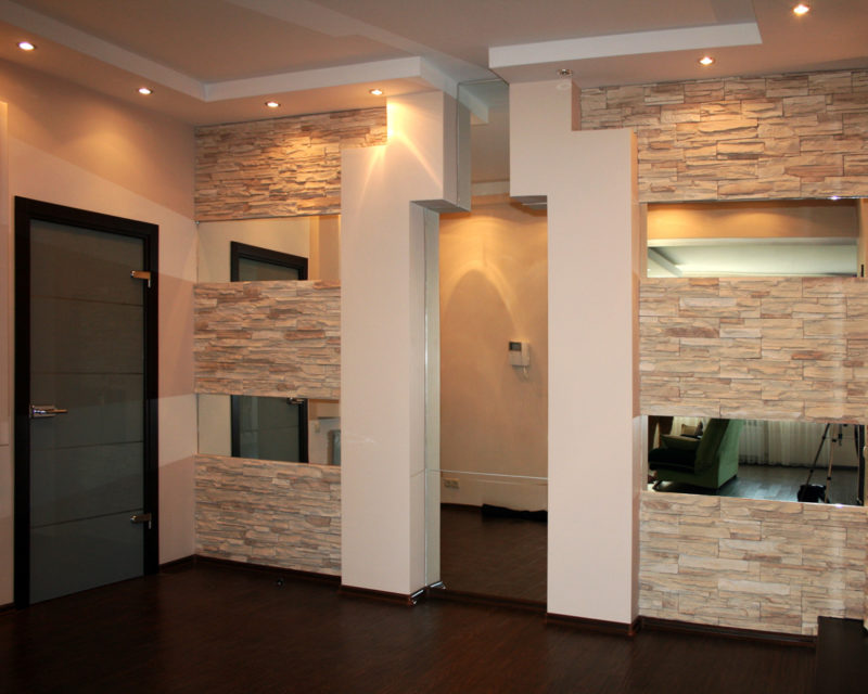 • Камень. Искусственный или натуральный камень для облицовки стен прихожей — удовольствие дорогое, поэтому его чаще всего применяют локально для защиты определенных зон коридора от повреждений.