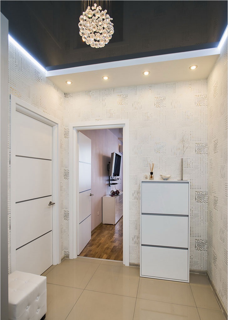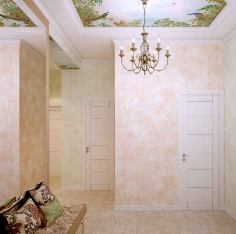 Способы отделки потолка прихожей возможны от классических до новомодных: побелка, покраска, оформление обоями или декоративной плиткой, подвесной или зеркальный потолок. В зависимости от вкусов, предпочтений и финансовых возможностей каждый из предложенных материалов будет уместен.