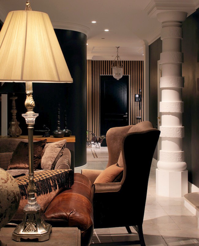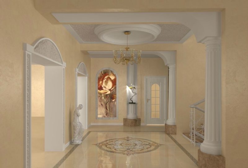 Помпезные рококо и барроко, ставшие стилем загородного дома, естественно сделают прихожую яркой в насыщенно розовых или красно-золотых тонах. Натуральные камни и цвета: мраморные, малахитовые, яшмовые — будут уместны в таких апартаментах.