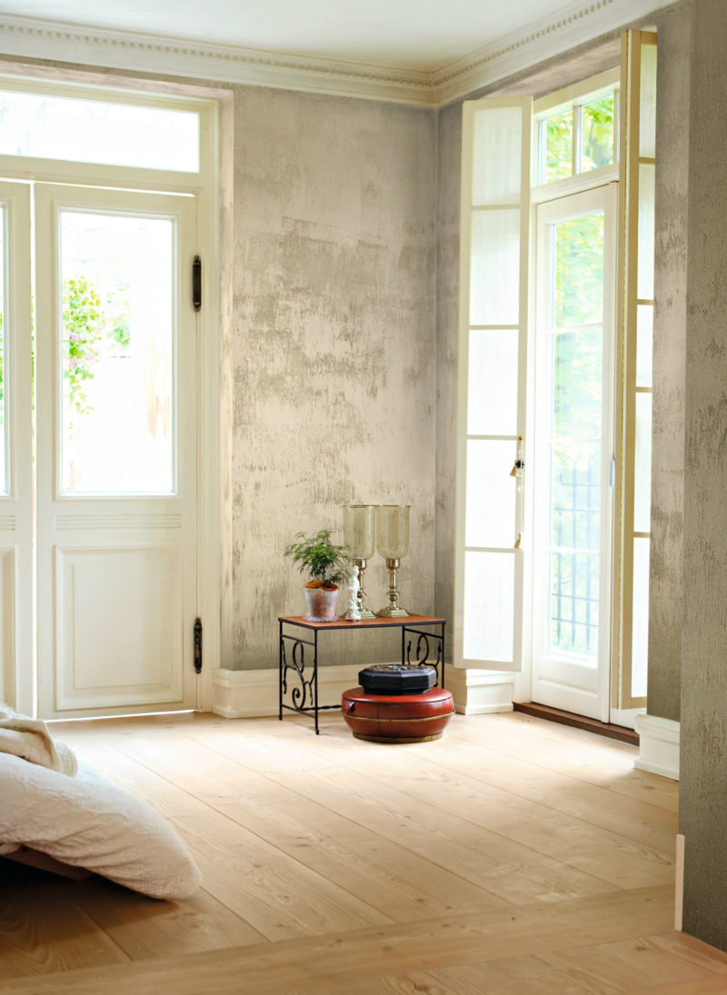 Обои на основе бумаги и нанесенного на нее кварцевого песка — современное эффективное решение для облицовки стен: не боится механического воздействия, огня и воды. Рисунки на обоях могут быть от простеньких орнаментальных до сложных, в форме старинных фресок.