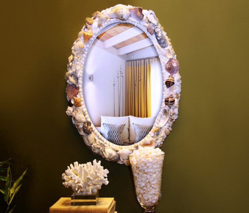 Трудно найти прихожую без зеркала. Возьмите ракушки, привезенные из теплых стран, и декорируйте его по окружности.  Или украсьте в морском стиле шпагатом. Из фотографий можно делать различные коллажи, панно и композиции и даже часы, если заменить ими циферблат. Обычные сучки, обрамленные в рамку, станут интересной вешалкой в доме.