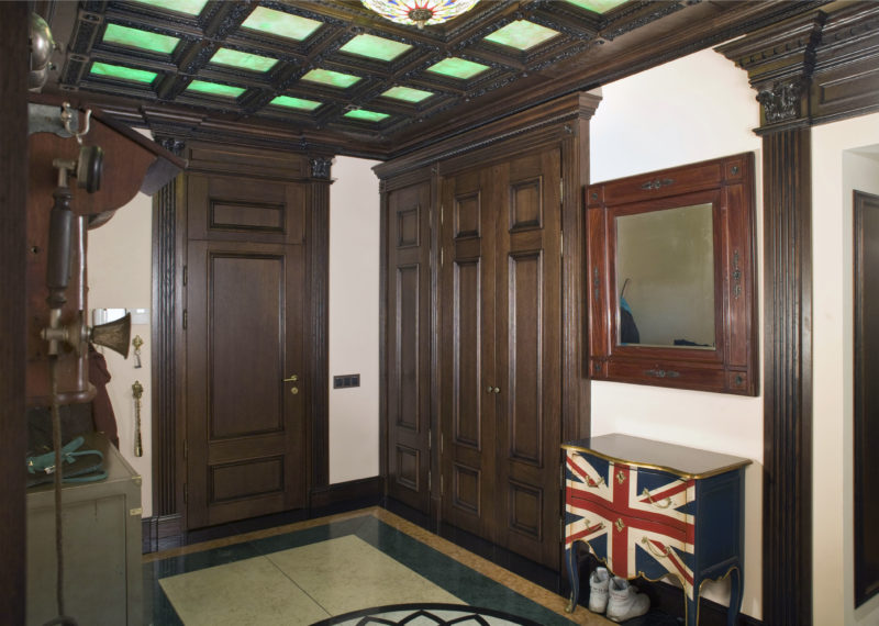 Дом в классическом стиле, требует, чтобы цвета прихожей были натуральными, приглушенными: орех, дуб, вишня. Возможно остановить выбор на традиционных белом или песочном оттенках.