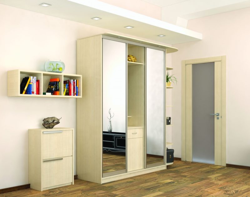 Популярно оставлять открытым пространство между шкафом-купе и стеной. Так можно не только сэкономить немного свободной площади, но и использовать ее для других целей. Например, можно смонтировать в полученной нише зеркало. Компромиссное решение для тех, кто не хочет заставлять свою прихожую мебелью – обустройство стеллажей с открытыми полками и вешалками. Так решаются сразу 2 проблемы: